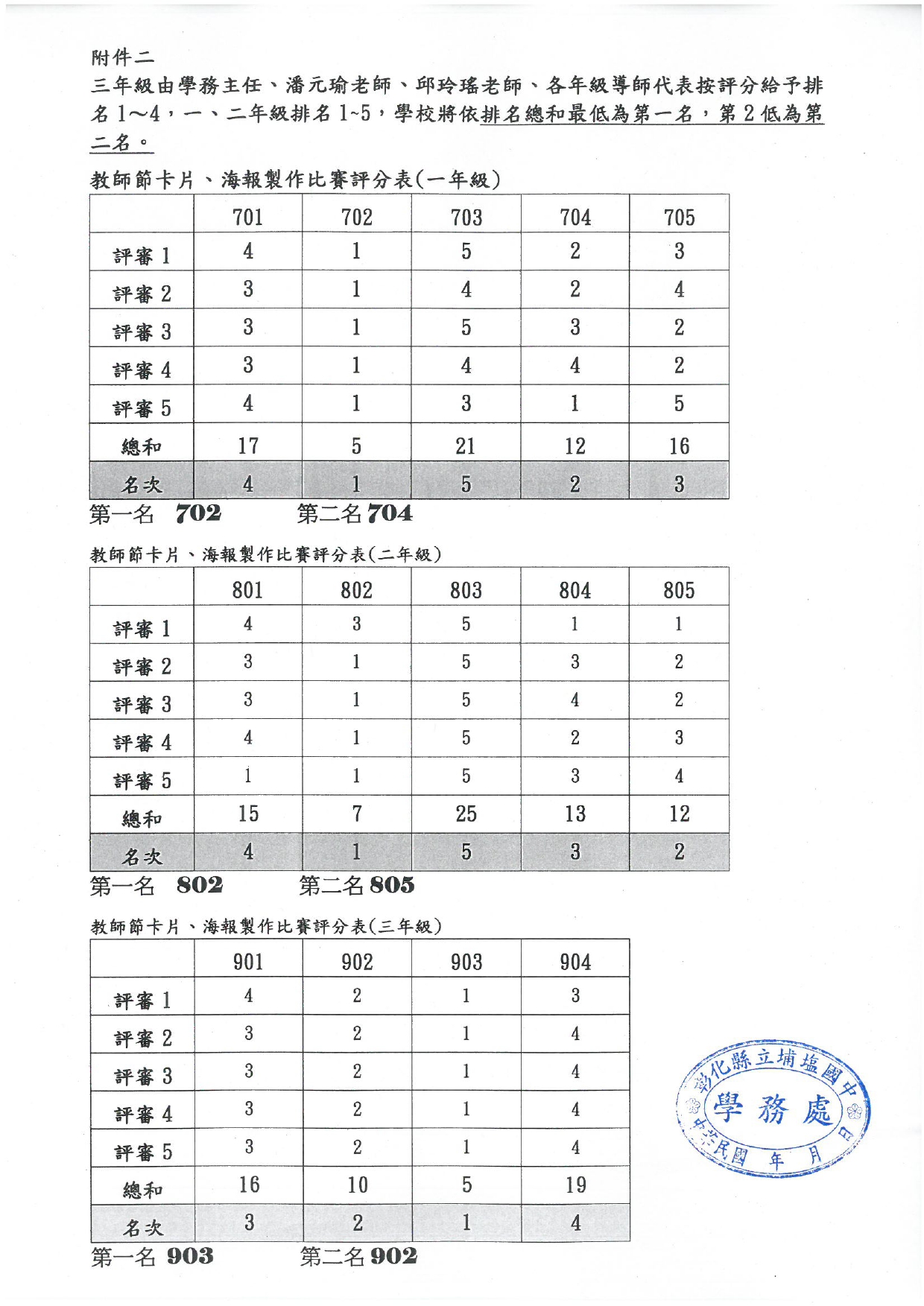 七年級組: 第一名 702 第二名 704