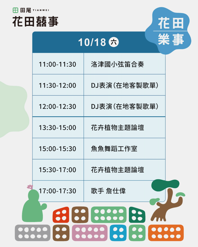 一、 | 「2025台灣設計展」系列活動(((田尾行|花田囍事)))即將在114年10月18日、19日10:00-18:00在隆盛樹化玉博物館舉辦「花田集市」及「花田樂事」活動,內容包含在地商家花卉植栽市集與現場音樂表演,邀請民眾及同仁共度花田假期。 |