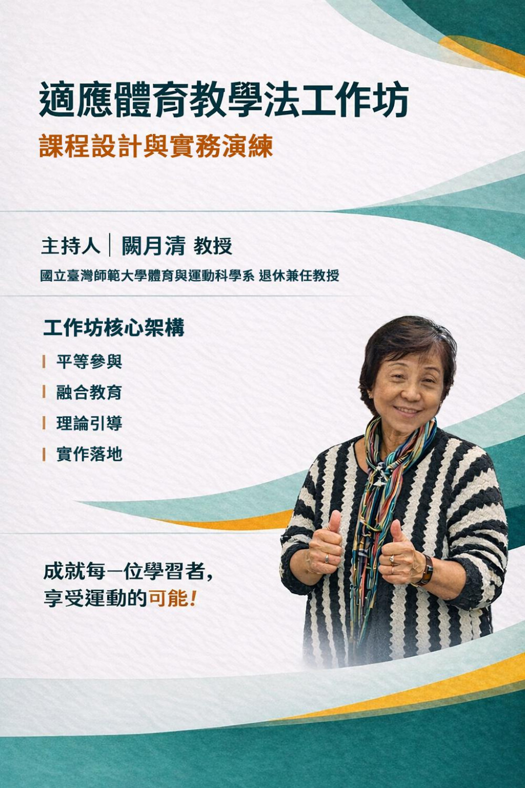 (四) 活動內容:本活動由講師結合相關理論模式,說明適應體育之課程設計與教學法,並透過實作引導學員將理論實際應 用於課程活動中。