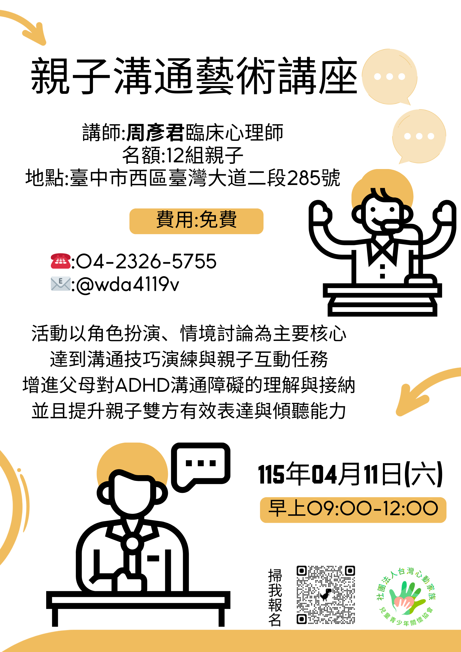社團法人台灣心動家族兒童青少年關懷協會辦理「115年04月 ADHD 相關主題講座」(共計三場次)